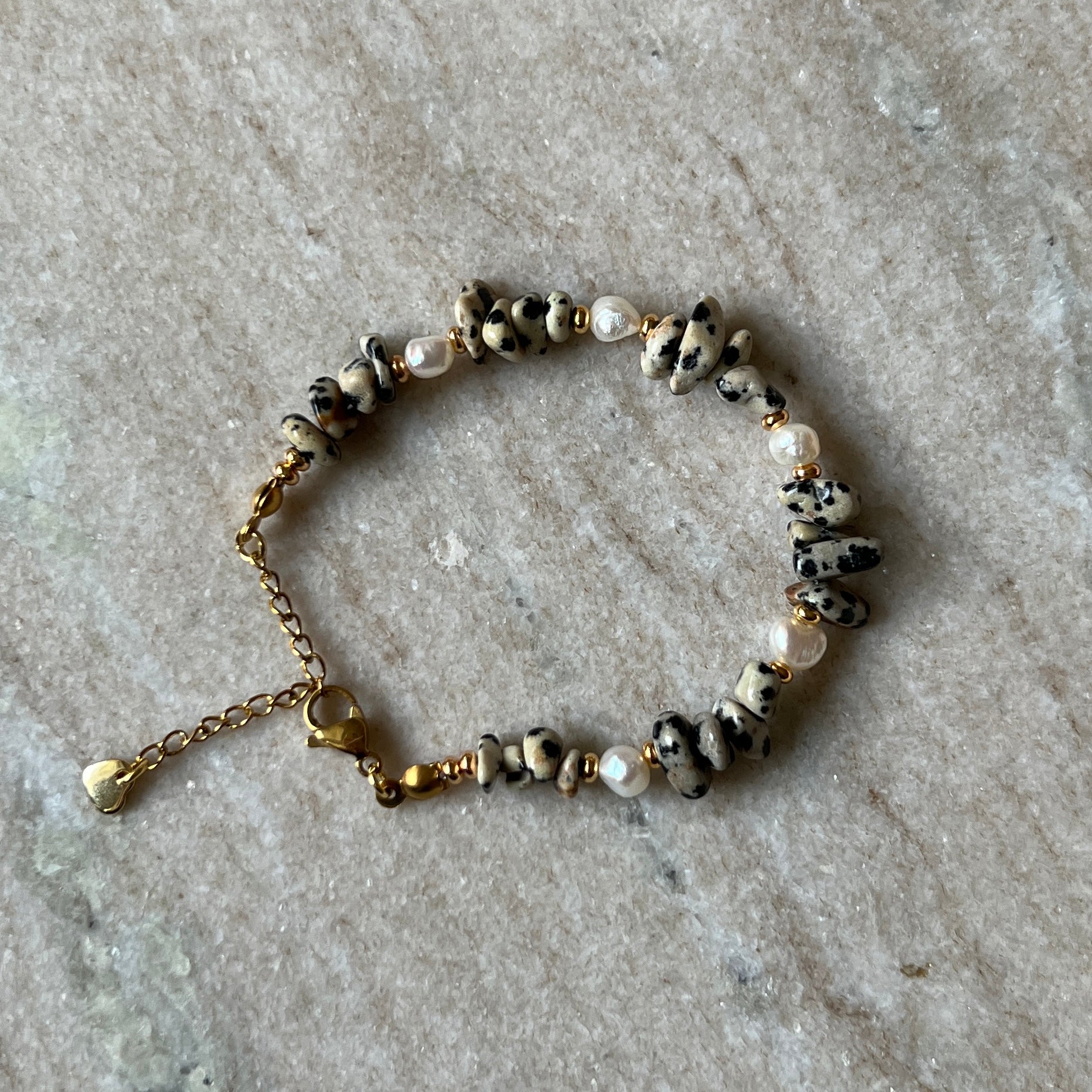 Tämä rannekoru yhdistelee maanläheisen dalmatian jaspiksen siruhelmien elävää kuviointia, viiden makeanvedenhelmen hohtavaa pintaa sekä kultaisia metallihelmiä, jotka tuovat kokonaisuuteen lämpöä ja eleganttia rytmiä.