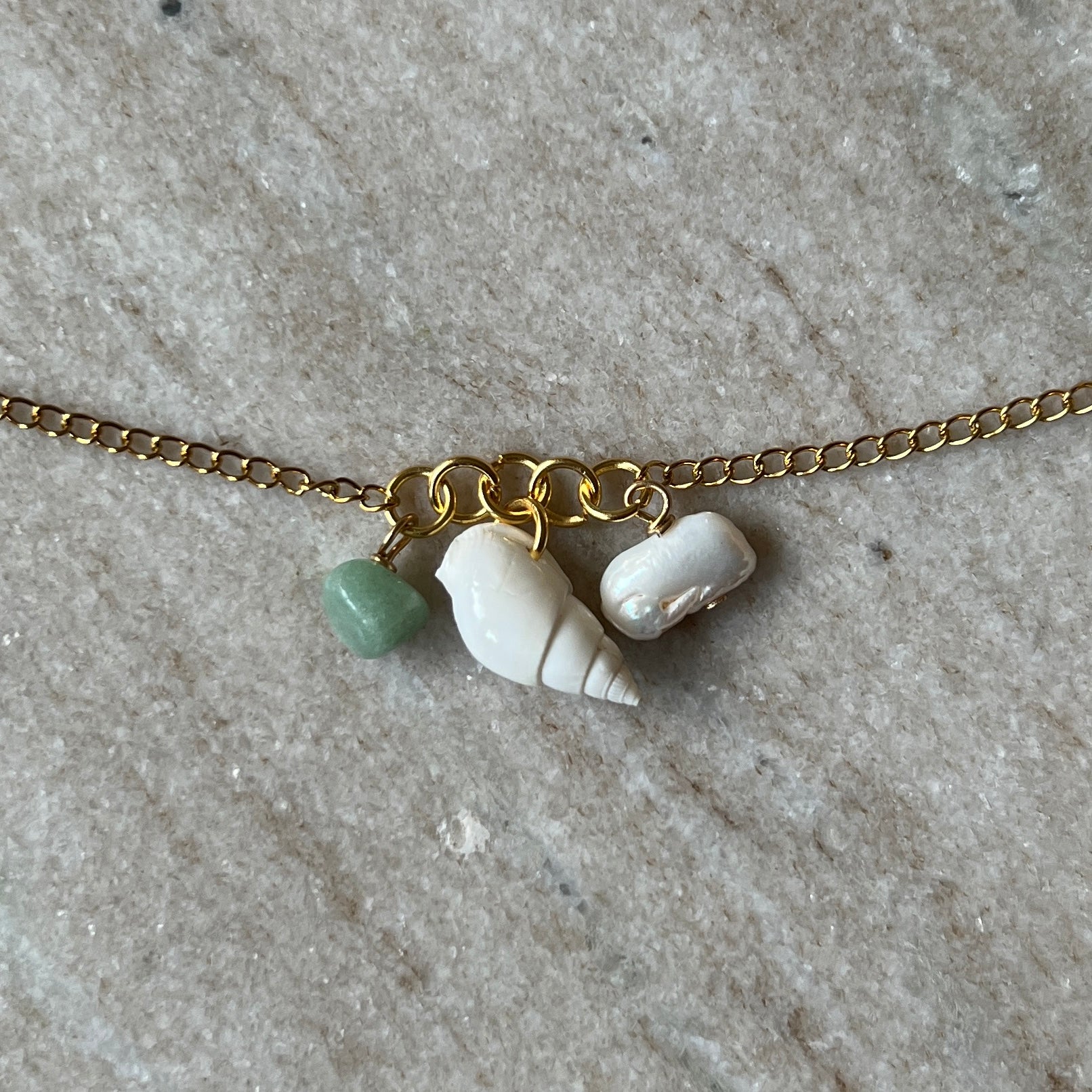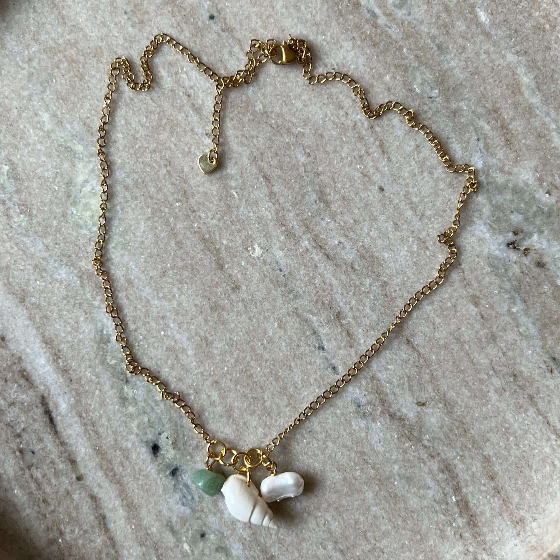 Tämä kaulakoru yhdistää pehmeästi hohtavan makeanvedenhelmen, vihreän aventuriinikiven ja orgaanisen simpukan, jotka roikkuvat kevyesti kullatusta ketjusta. Jokainen elementti tuo mukanaan oman tunnelmansa - helmi lempeyttä, aventuriini rauhaa ja simpukka rennon kesäistä energiaa.