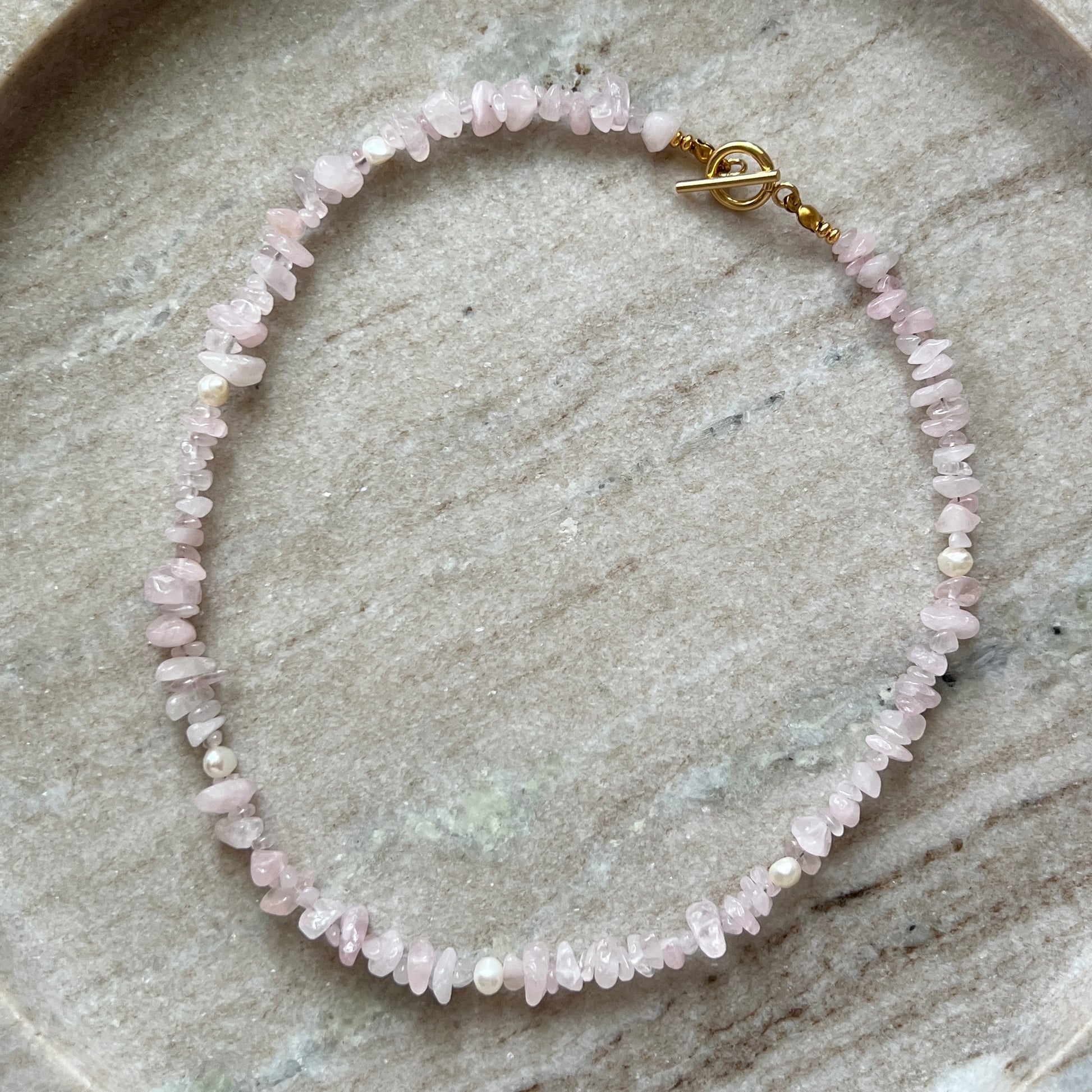 Tämä kaulalle istuva choker-koru yhdistelee herkkiä ruusukvartsin siruhelmiä ja makeanvedenhelmiä, luoden romanttisen, mutta modernin kokonaisuuden. Vaaleanpunaisen ja helmenvalkoisen sävyt täydentävät toisiaan pehmeästi ja sopivat monenlaisiin asukokonaisuuksiin.